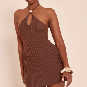 CHOCOLATE HALTERNECK BEAD DETAIL KNIT MINI DRESS