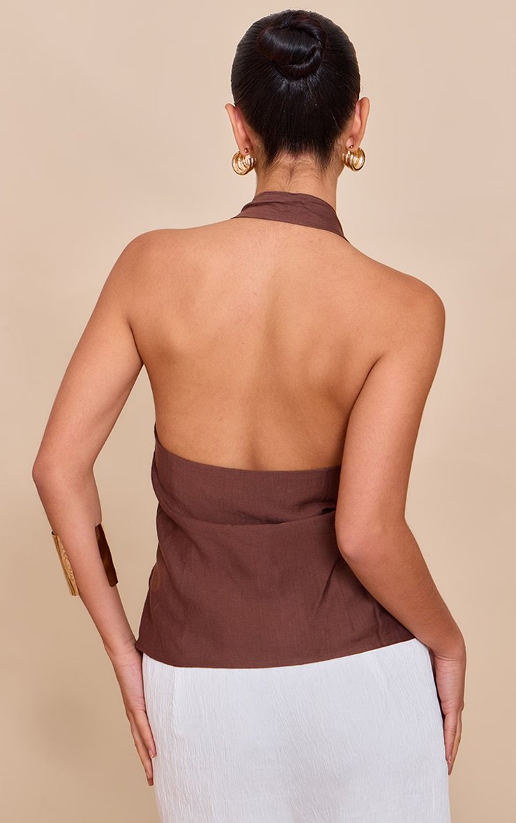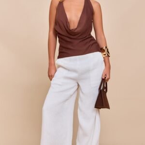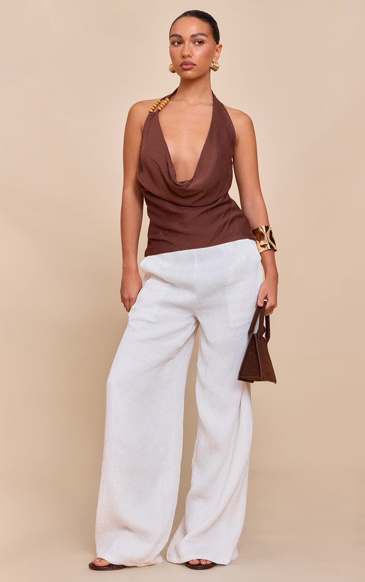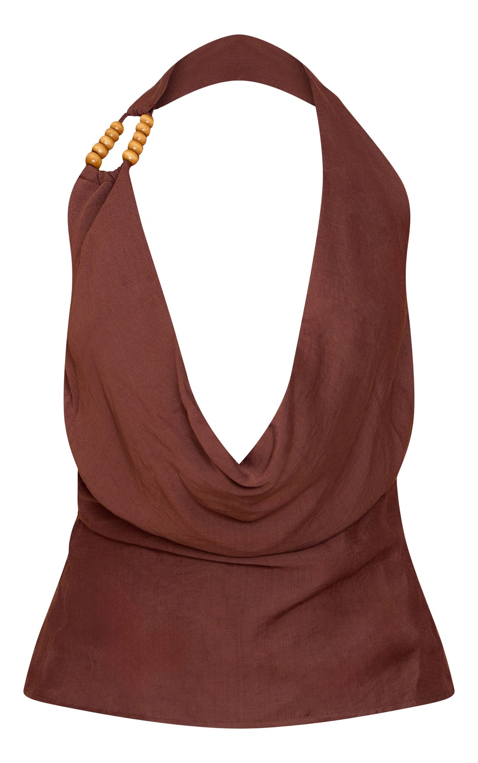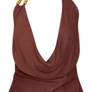 This top defines sophisticated ease for any evening plan. The chocolate linen look bead detail cowl neck top brings a knowing elegance with its flowing silhouette. Its dramatic cowl neckline drapes beautifully, leading to a chic halter strap finished with unique wooden bead embellishments. Pair this essential piece with crisp tailored or wide leg trousers to complete a confident, polished ensemble.