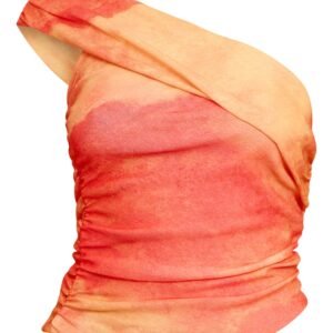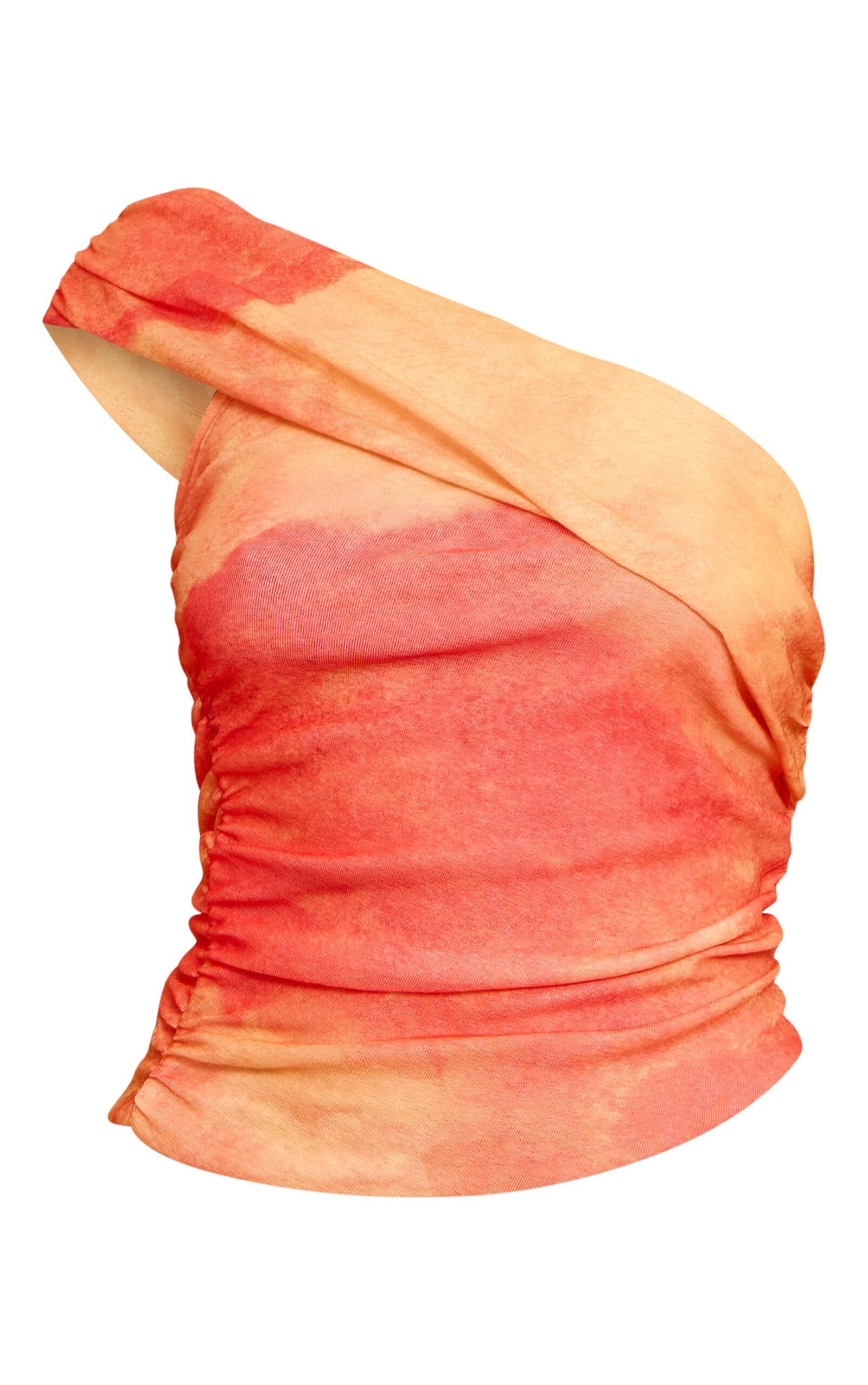 ORANGE ABSTRACT PRINT ONION SKIN RUCHED SIDE ASYMMETRIC TOP