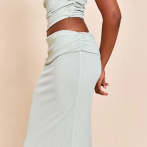 This sage maxi skirt redefines evening form. The sage onion skin low waist maxi skirt sits low on the waist, creating a clean, elongated line that sweeps to the floor. Subtle ruching adds strategic detail around the hip. Simply add the co-ordinating crop top and sharp heels for a confident evening presence.